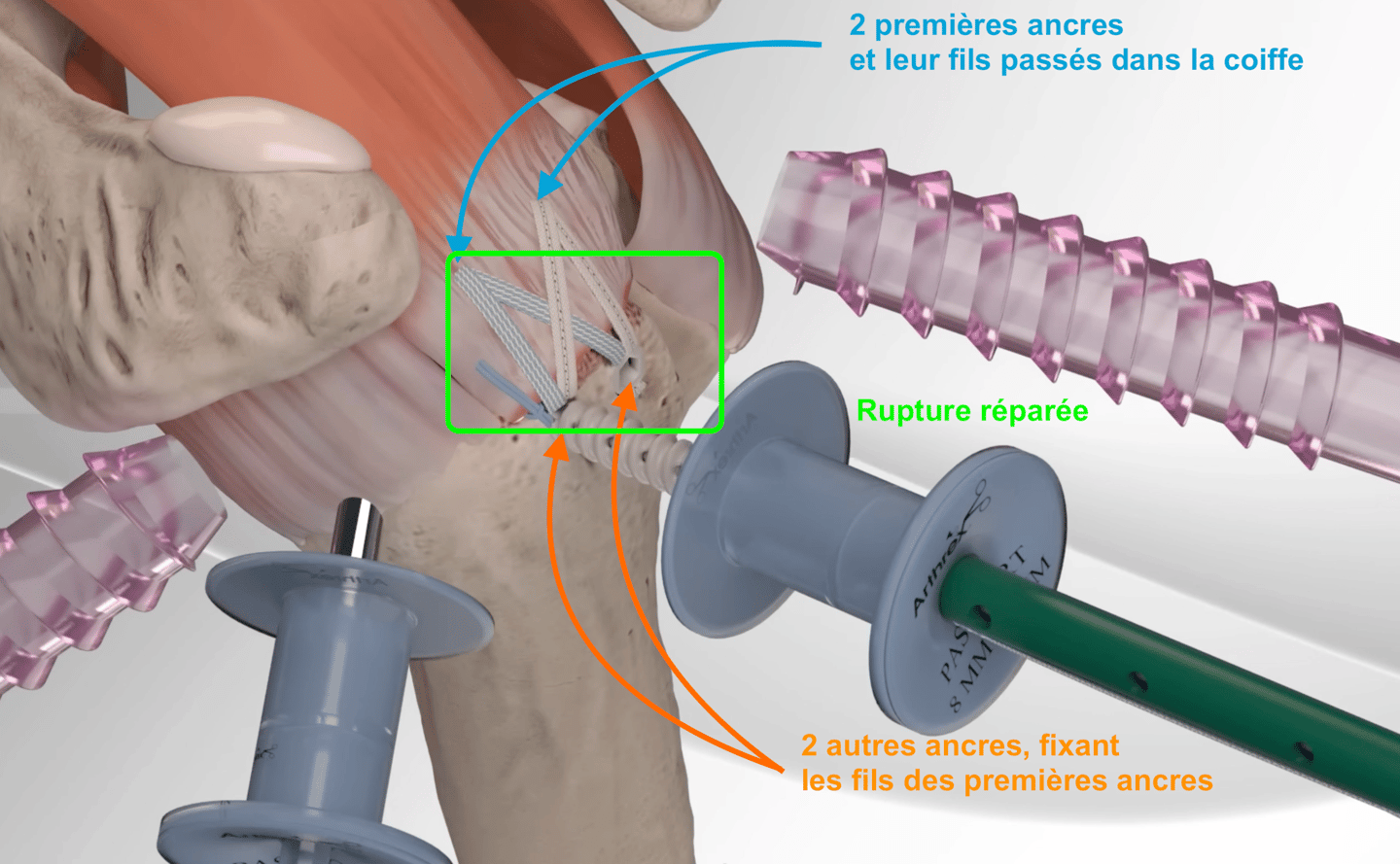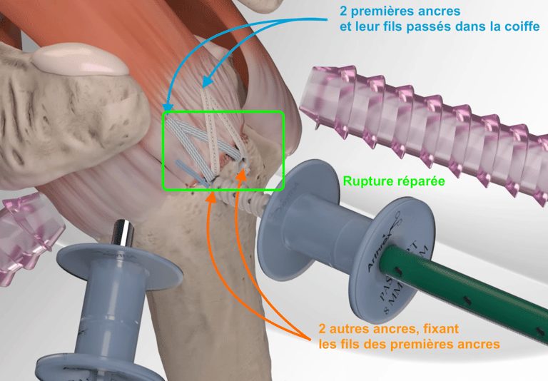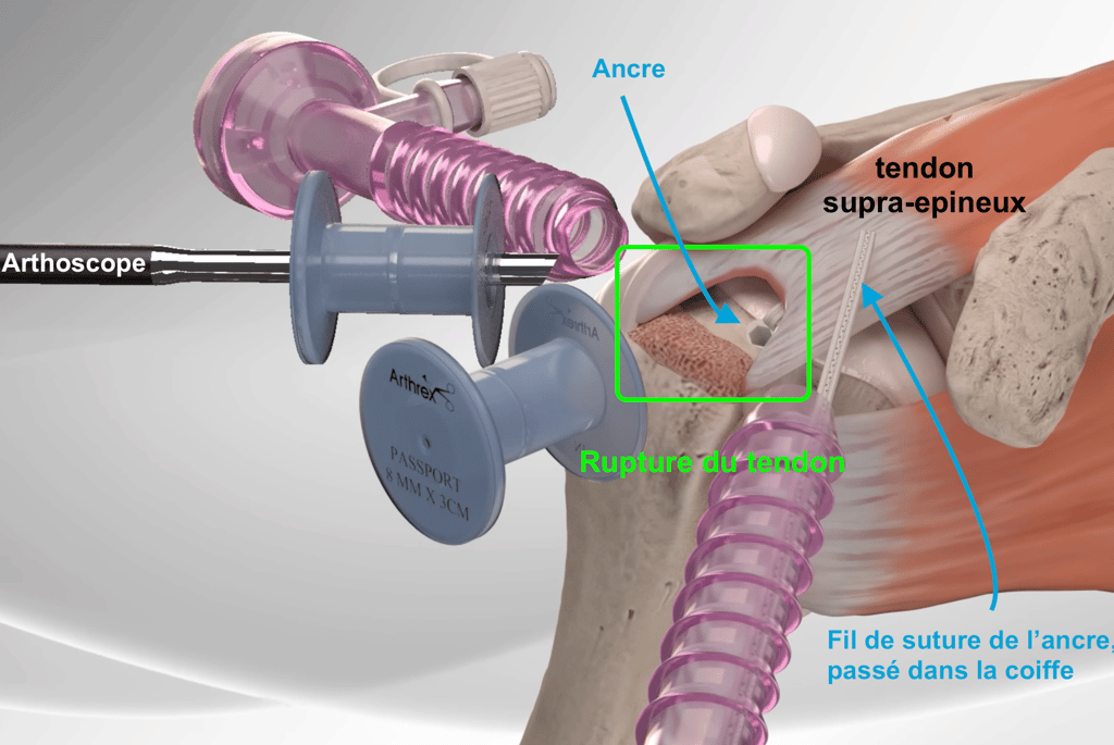 L'intervention consiste a réinsérer sur l'humérus, par une ou plusieurs ancres, le ou les tendons rompus.