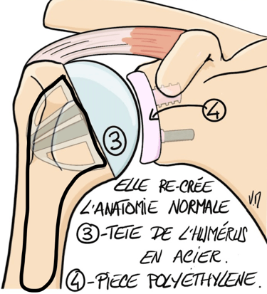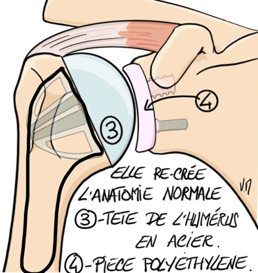 Un implant sphérique en métal (3) est mis en place dans l'humérus, tandis qu'une cupule en plastique ( PE)(4) est mise en place dans l'omoplate.